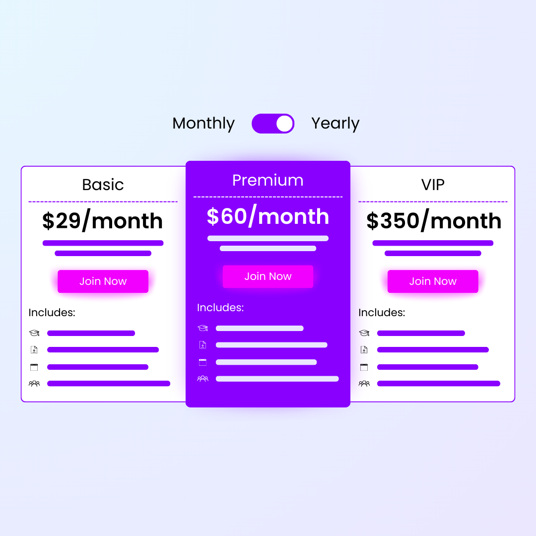 Customize your membership offerings with multiple tiers to cater to different audience segments. Provide basic, premium, and VIP tiers to attract a wider range of customers with varying learning journeys, needs and budgets.