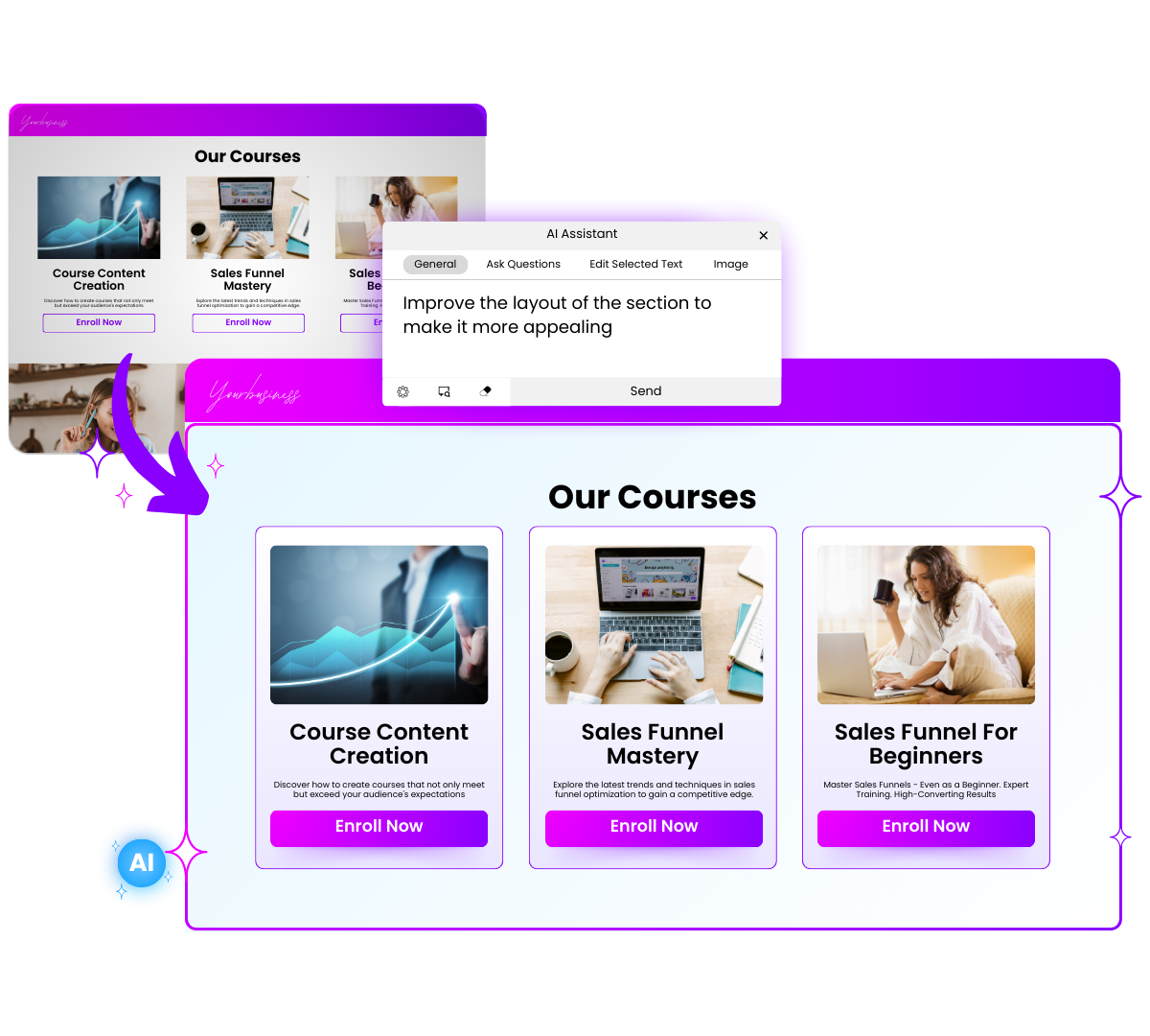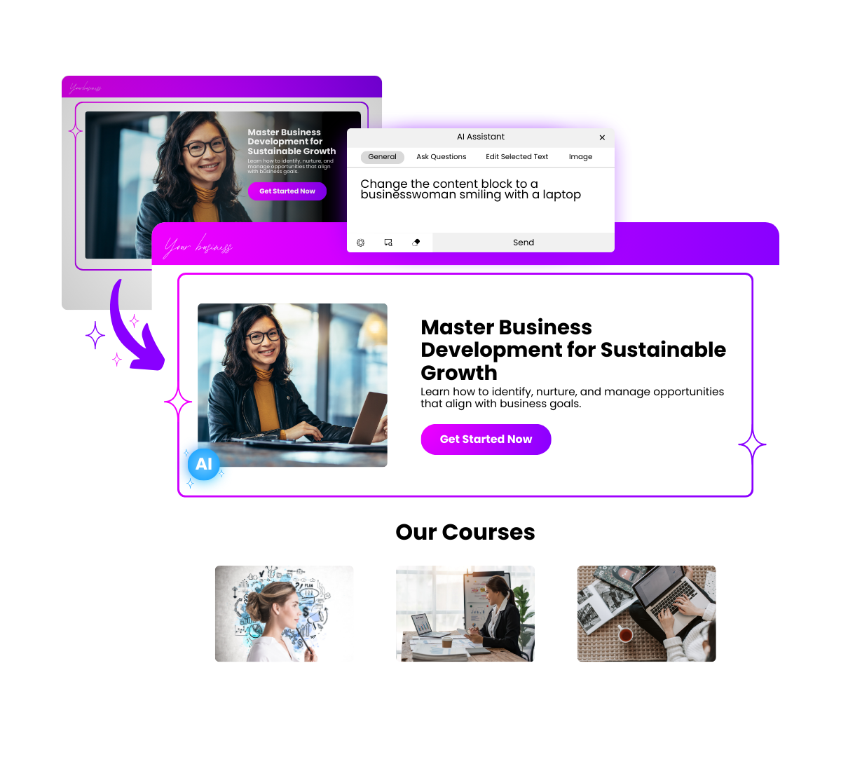 Effortlessly create beautiful, professional designs by using simple conversational commands. Start with our stunning templates and easily customize them to align with your brand. Whether you’re redesigning sections, generating tailored images, or adding new site elements like sliders and headers, our AI makes the process seamless and intuitive.